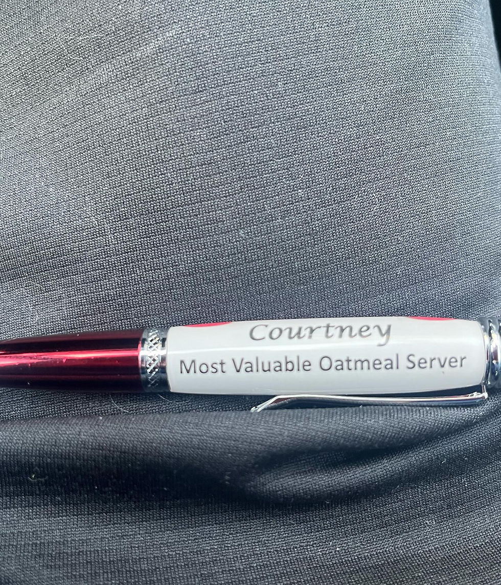 Courtney works at the WAWA where I get oatmeal 2-3 times a week. She is always kind, friendly, efficient and seems to know everyone who comes in. To show my appreciation, I created a special pen for her. As one of my mentors once said”It’s nice to be nice to the nice”